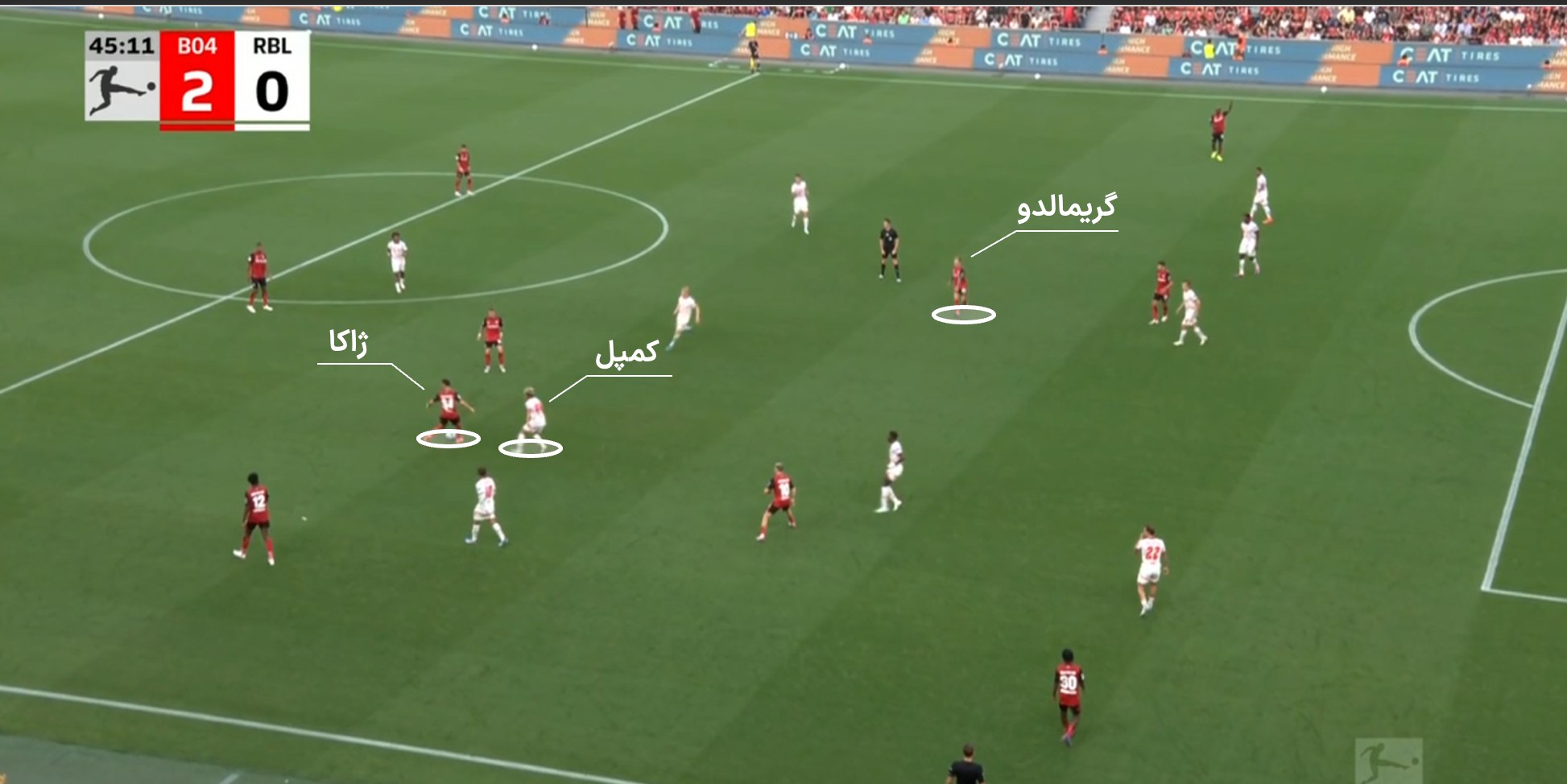 گرچه اعمال فشار فعال روی بازی‌سازهای میانی مقابل تیمی مانند لورکوزن،‌ امری حیاتی و ارزشمند است، اما مادامی که این امر باعث ایجاد فضا در بین خطوط مهره‌های شما شود، بازیکنانی بسیار خطرناک آماده‌ی گزیدن خط دفاعی رقیب در فضاها پرسه می‌زنند. در دقیقه‌ی ۴۵ بازی،‌ پس از شیفت کردن بازی از چپ به راست توسط فلورین ویرتز عقب کشیده و تپسوبا در میانه‌ی زمین لایپزیش، توپ را به ژاکا می‌سپارد. کوین کمپل به سرعت برای محدود کردن هافبک سوئیسی به جلو حرکت می‌کند و فلورین ویرتز با مشغول کردن لوکبا، فضای ورود گریمالدو به میانه‌ی زمین را فراهم می‌کند. مدافع اسپانیایی در بین خطوط لایپزیش صاحب توپ شده و آن را به تریر در پشت خط دفاع می‌سپرد و به واسطه‌ی چرخه‌ای از اتفاقات درون محوطه جریمه، نهایتا الکس گریمالدو برای دومین بار دروازه‌ی مهمان را باز می‌کند. هیچ چیز برخلاف انتظارات پیش نرفته و اگر زمان‌های از دست رفته‌ای چون مصدومیت حیدرا در برخورد با بونیفیس و کارت زردهای متوالی مارکو روزه و اخراج وی از کنار زمین نبود، کسی از اختلاف دو گله‌ی دو تیم متعجب نمی‌شد. اما بازی زیبا روایت متفاوتی را برای هواداران صبور خود در نظر گرفته بود.