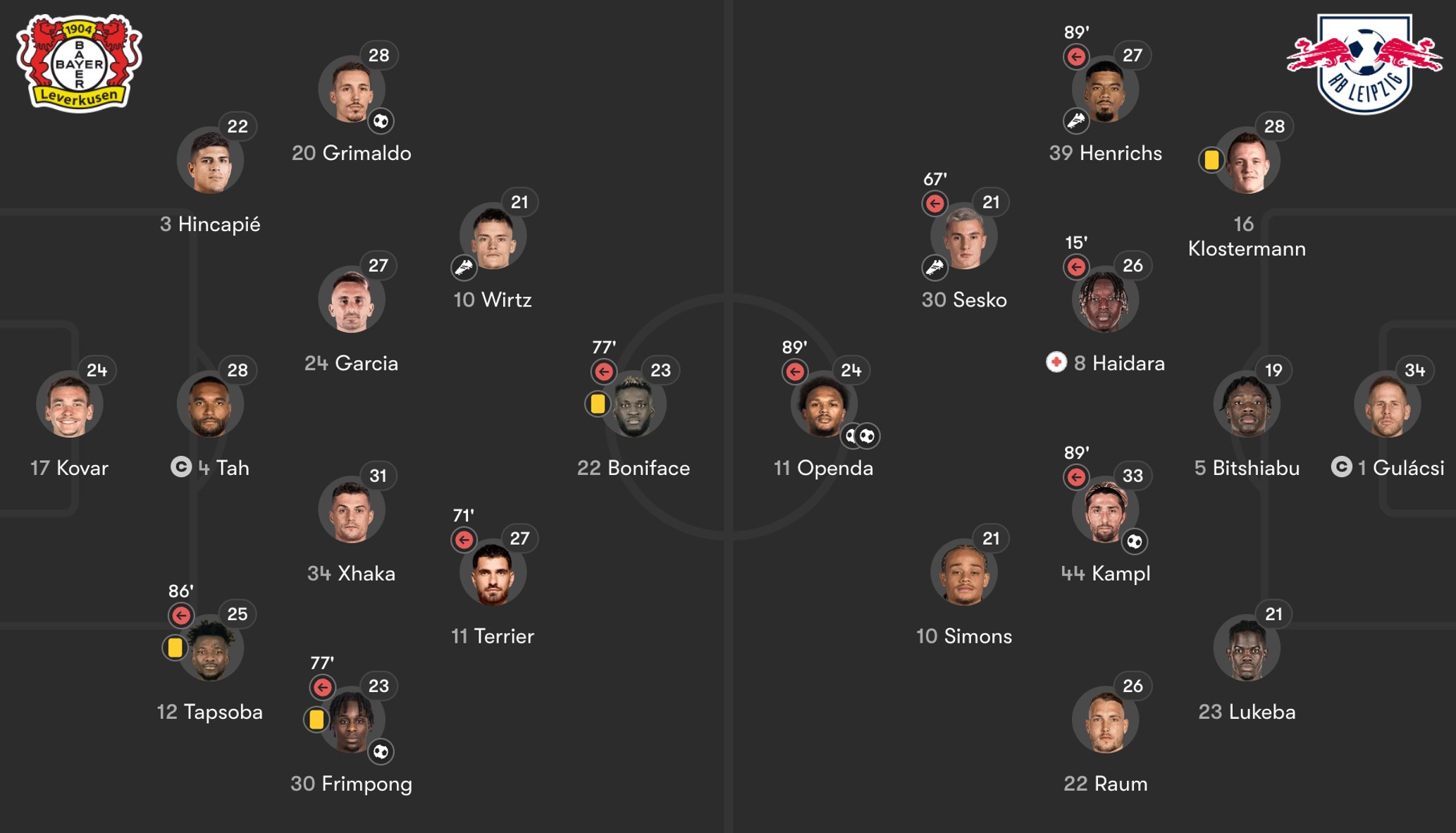 ژابی آلونسو با همان چیدمان همیشگی شاگردان خود را روانه‌ی میدان کرده بود. در درون دروازه، با بیماری هرادسکی،‌ فرصت به ماتی کوار ۲۴ ساله رسید. در خط دفاعی سه نفره، پیرو هینکاپیه، جاناتان تاه و ادموند تپسوبا قرار گرفتند. الکس گارسیا خرید جدید لورکوزن از جیرونا و گرانیت ژاکا در مرکز عهده‌دار بازی‌سازی تیم شدند. گریمالدو و فریمپونگ با وجود قرارگیری در پست وینگ‌بک،‌ مثل همیشه در ایجاد برتری عددی در میانه‌ی میدان به بازیکنان میانی تیم خود کمک می‌کردند. فلورین ویرتز و مارتین تریر پشت مهاجم در نیم فضاها به تهدید مدافعین لایپزیش ‌می‌پرداختند و ویکتور بونیفیس در قلب خط حمله آماده‌ی رویارویی با دروازه حریف بود.
