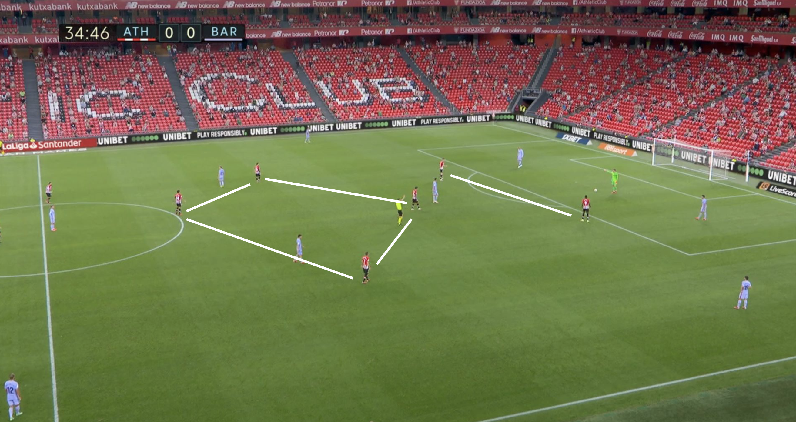 اتلتیک هنگام پرس بارسلونا در یکسوم دفاعی این تیم از ۲-۴-۴ خطی به ۲-۴-۴ لوزی تغییر شکل میداد تا دو مهاجم این تیم فرصتی برای پرس کردن مدافعان میانی بارسلونا و دروازهبان این تیم داشته باشند و راس بالایی لوزی نیز بوسکتس را مهار کند. دو راس کناری نیز هافبکهای شماره هشت بارسلونا یعنی دییونگ و پدری را پوشش میدادند و در صورت رسیدن توپ به فولبکهای بارسلونا به همراه مهاجمین تیمشان تلاش میکردند تا آنها را در گوشه زمین نگه دارند و توپ را پس بگیرند. آخرین بازیکن حاضر در لوزی نیز تلاش میکرد فضای پشت سر این بازیکنان را کنترل کنند و بارسلونا نمیتوانست از پرس رقیب خارج شود.