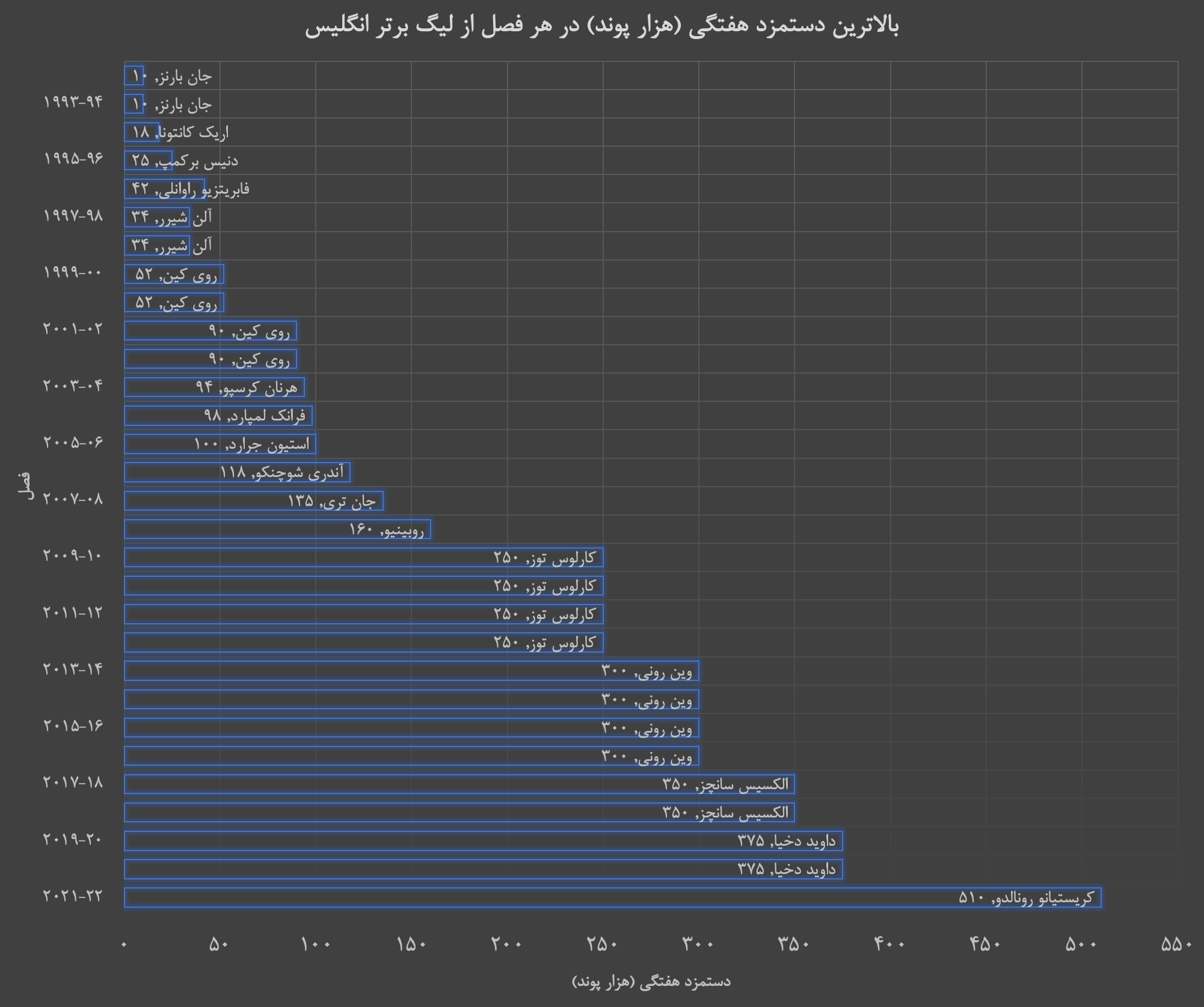 در سالهای اخیر دستمزد بازیکنان فوتبال به شکل تصاعدی بالا رفته و حالا دیگر حتی بازیکنان معمولی در لیگهای بزرگ نیز دستمزد میلیونی میگیرند. نمودار زیر بیشترین دستمزد دریافتی هر بازیکن در لیگ برتر را از آغاز یعنی فصل 93-92 تا به امروز نشان میدهد.