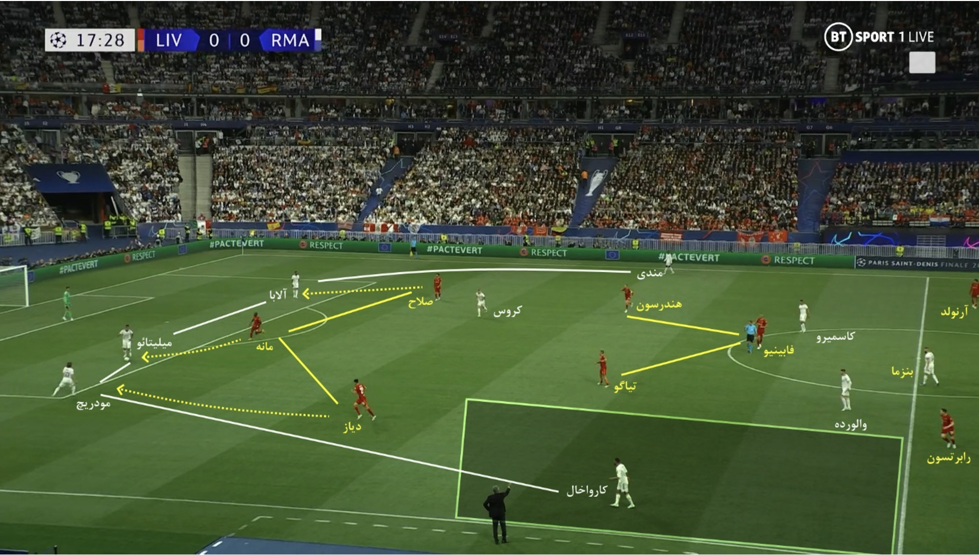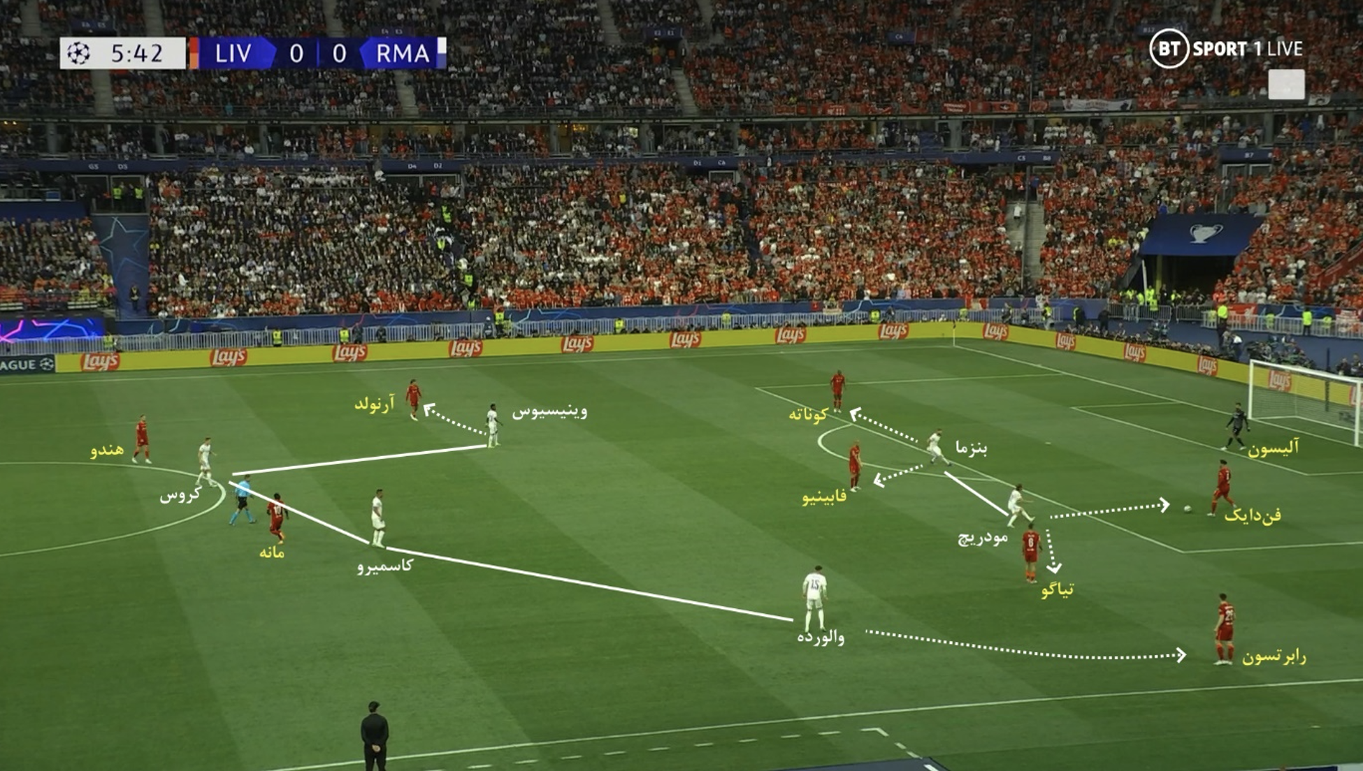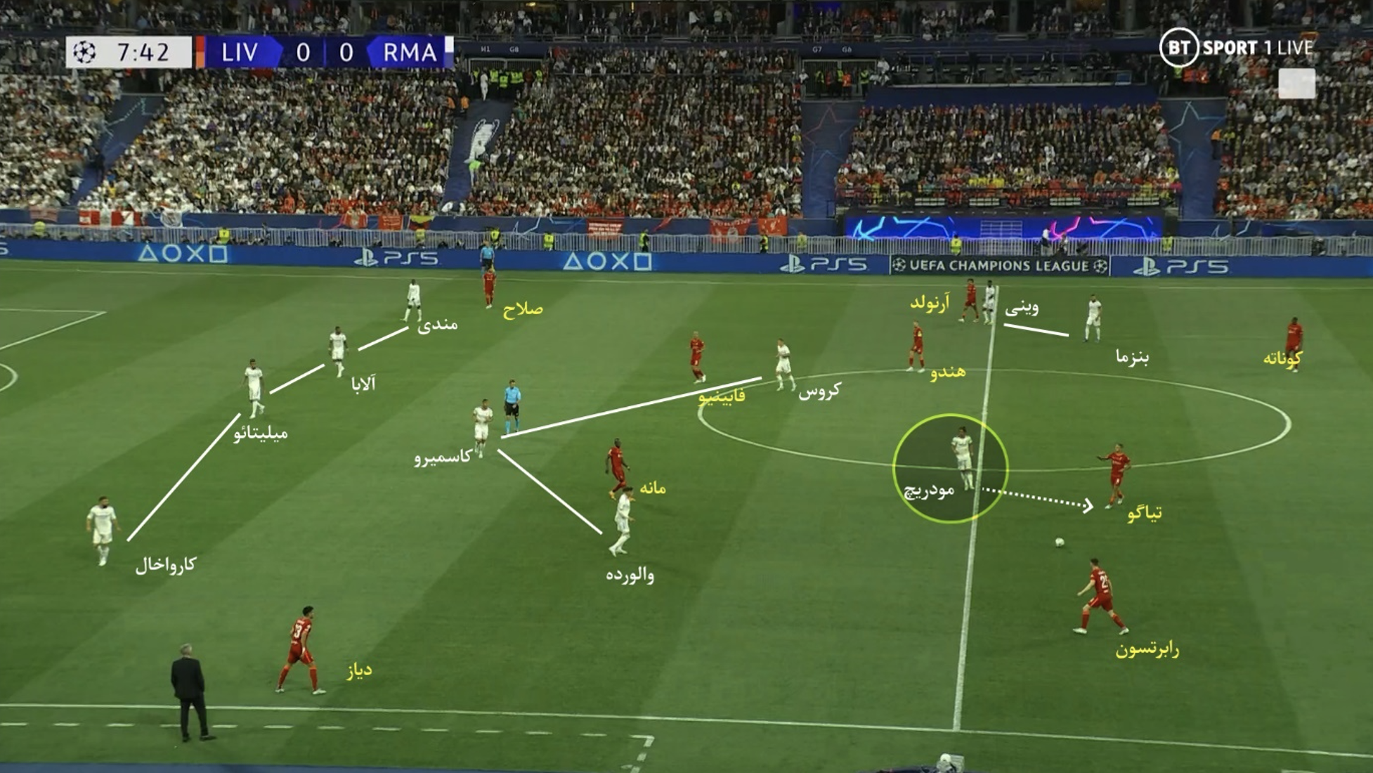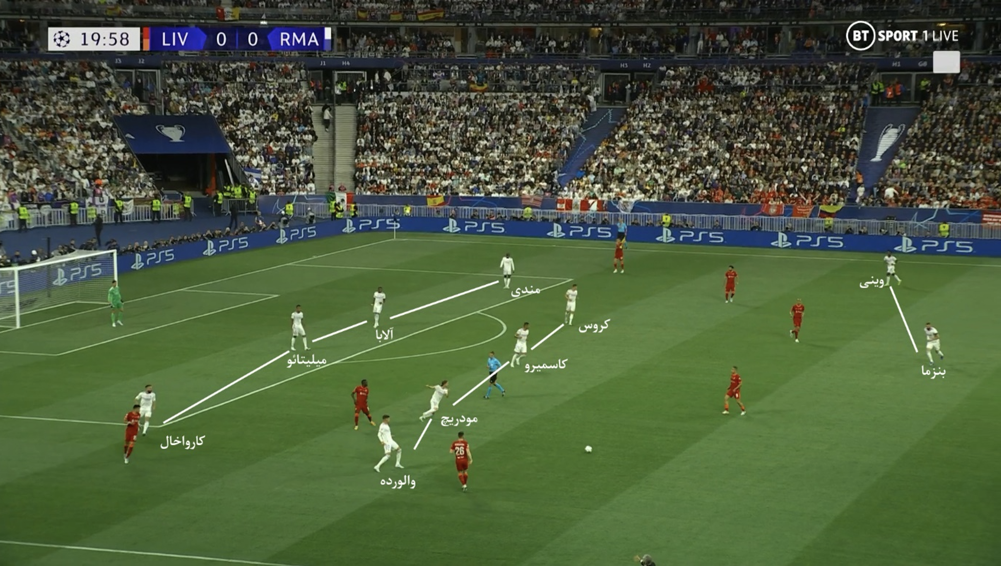 بنا به آنچه در تصویر بالا مشاهده میکنید، مودریچ با عقبروی به خط اول ساختبازی اضافه شده و با دو مدافع میانی رئال یک خط عریض 3 نفره را تشکیل داده تا مدافعان کناری بیپروا بالا بیایند و با عریض کردن زمین بازی، فشردگی و تراکم دفاع لیورپول را به چالش بکشند. در میانهی زمین کاسمیرو با قرارگیری استادانه بین مدافعان و هافبکان لیورپول آنها را وادار به تعلل در اقدام پرس همهجانبه میکند و متعاقبا منجر به واگرایی حرکاتشان نسبت به نقطه مرجع (توپ) میشود تا تیم برای حفط انسجام واحد دفاعی به عقب هل داده شود (Push the Press).