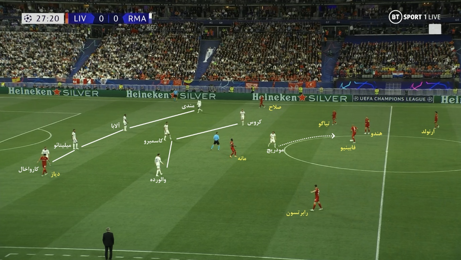 خط دفاعی را تا حد ممکن به دروازهی خودی نزدیک کنیم. آیا میتوان ساختار دفاعی رئال مادرید را به همین تک گزاره مختصر کرد؟ ساختار دفاعی رئال آنچلوتی به تناسب مالکیت لیورپول در هر مکان و زمان از بازی متنوع و غنی از ریزجزئیات تعیینکننده نتیجهی بازی است. سفیدهای شهر مادرید بسته به فاز ساختبازی و گردش توپ در هر یکسوم زمین، آرایش ویژهای برای کنترل قدرت هجومی تیم انگلیسی داشتند.