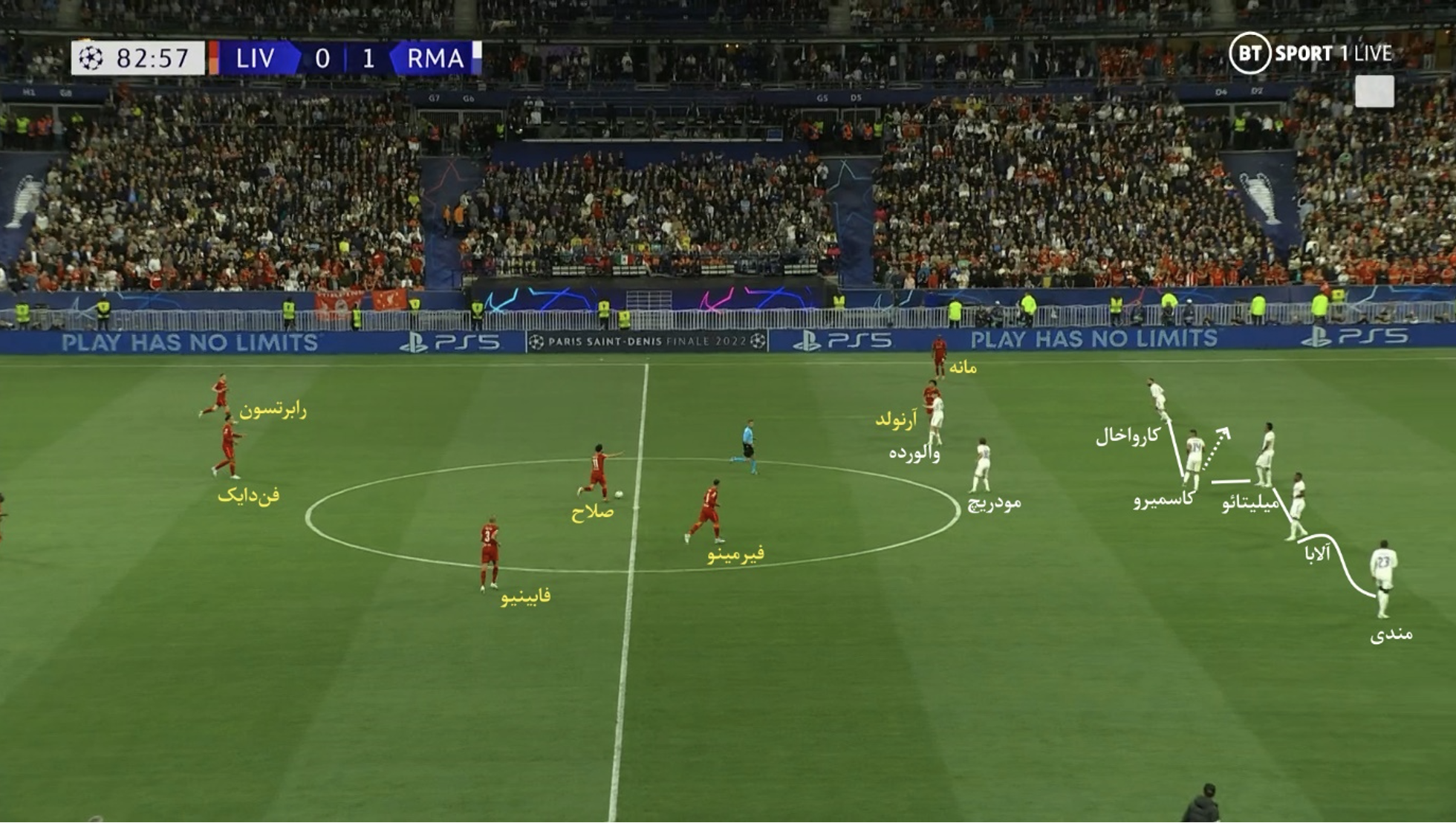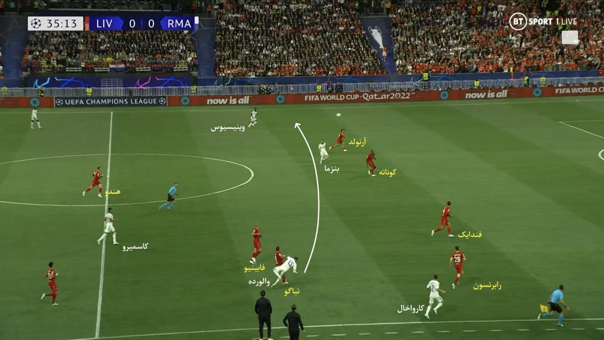 دقیقه 25، بعد از فشار اولیهی لیورپول، رئال لحظاتی در امر گردش توپ موفق است و با تعداد نفرات محدود سعی در نگه داشتن توپ در زمین حریف و خلق فضا میکند. والورده برای حمایت از زوج وینیسیوس و بنزما از پست اصلی خود خارج میشود و به آنها گزینهی پاس اضافی میدهد. راس پویای مثلث خط حملهی رئال با جابجاییهای مکرر و توانایی حمل توپ در فضاهای تنگ، لیورپول را وادار میکرد که برای حفظ فشردگی پرس بالای خود ناخواسته مجبور به تغییر شکل شود و فضای زیادی را در کنارهها به مادریدیها بدهد.