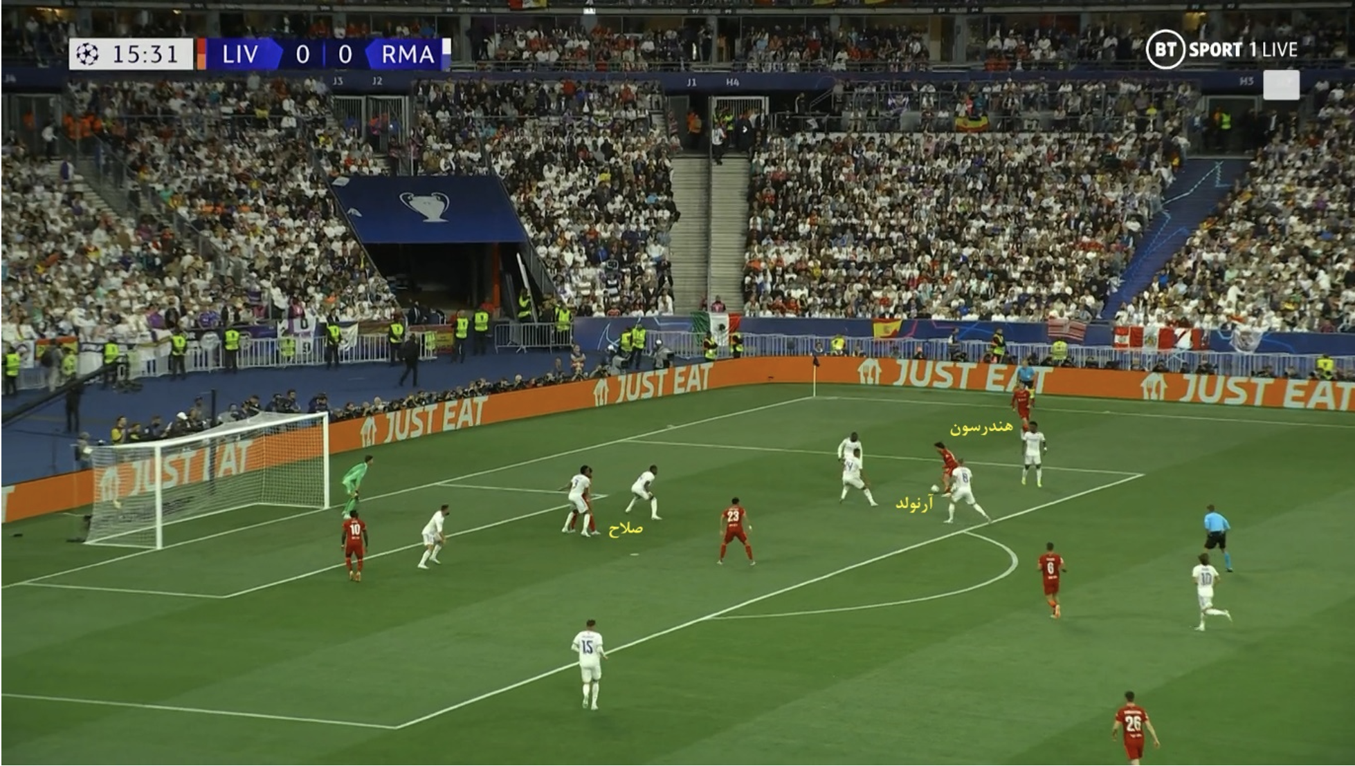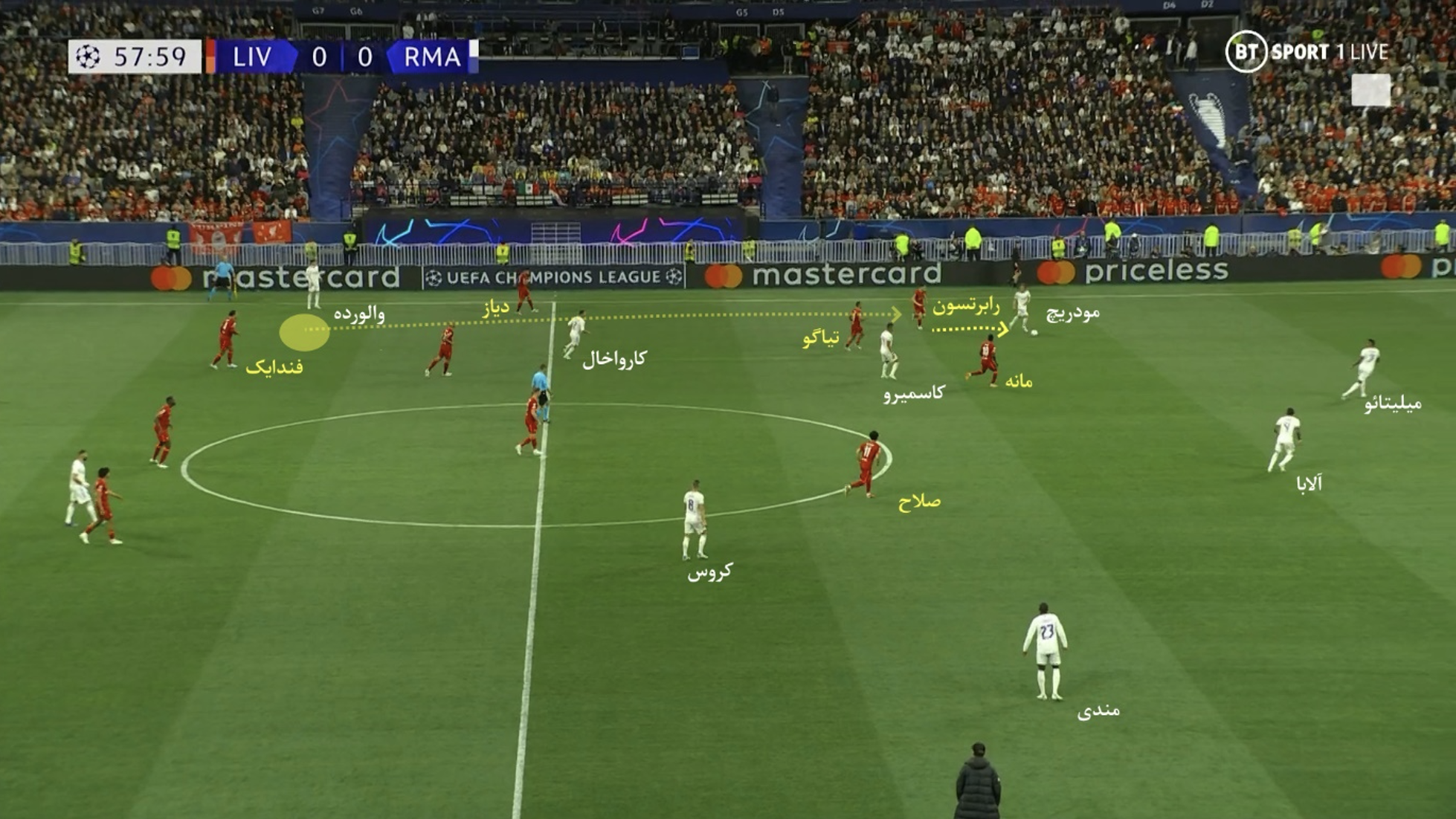عملکرد فوقالعاده و منعطف ساختار دفاعی رئال مادرید در یکسوم خودی نیز پا برجا است. مانند تصویر زیر، آرایش دفاعی منظم و خطوط متراکم مادرید فضایی را به بازیکنان لیورپول برای موقعیت گلزنی نمیدهند و در هر ناحیهی زمین بازی، اصل برتری عددی را متعهدانه رعایت میکنند. با عقبروی بنزما مودریچ به کمک والورده در یک خط جايگیری میکند تا با نفود رابرتسون، والورده با خیال جمع نیمفضا را رها و به کناره حرکت کند.