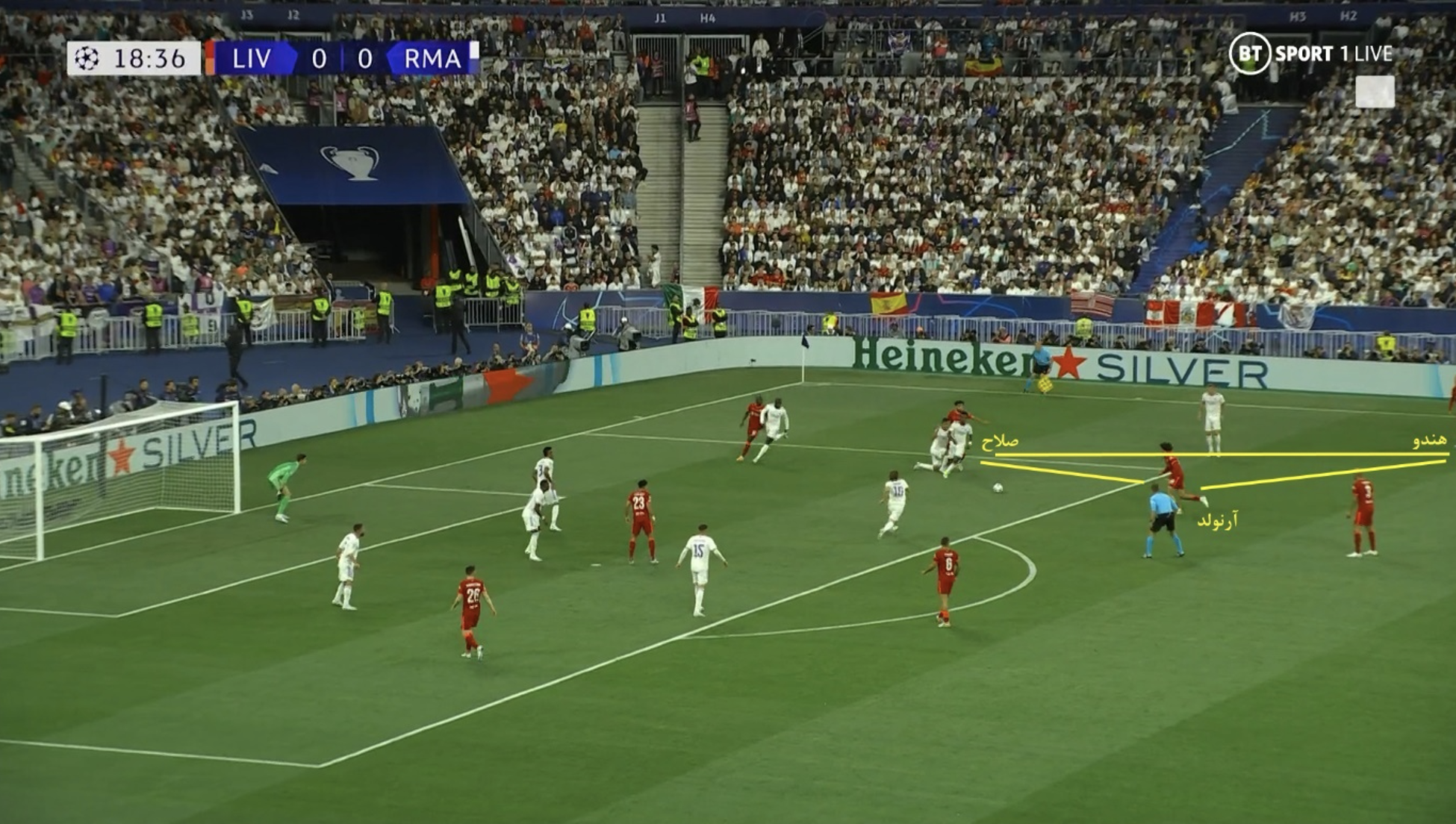 هندرسون با دوندگی و تلاش بیوقفه به دنبال به هم زدن نظم دفاعی رئال بود و با حرکت از داخل به کنارهها سعی بر به حرکت در آوردن کروس به منظور باز شدن کانالهای میانی داشت (runner role)؛ و محمد صلاح این فرصت را پیدا میکرد که با حرکت به درون محوطه خود را با مدافعان میانی رئال ایزوله کند و با شم گلزنی خارقالعاده کار را برای مدافعان رئال سخت کند.