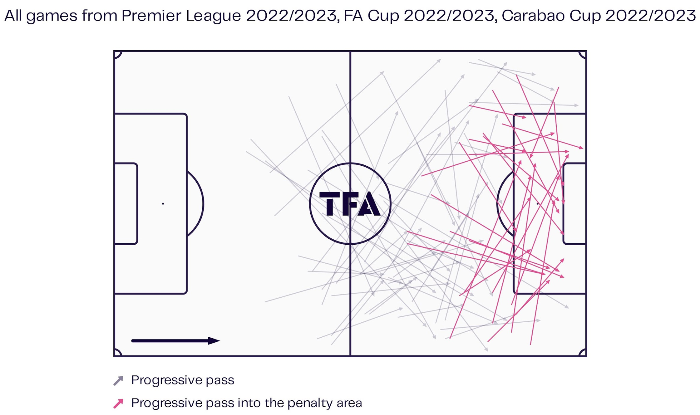 نقشه‌ی پاس‌های پراگرسیو ماتئوس نونز در فصل ۲۳-۲۰۲۲ (منبع: Total Football Analysis)
