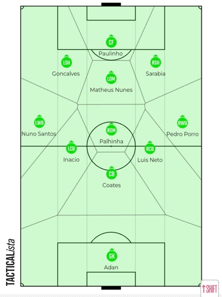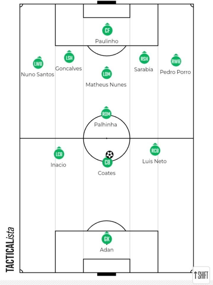 اگرچه که همچنان با حضور آدان درون دروازه، بالا بازی کردن برای اسپورتینگ یک ایدهی ریسکی به حساب میآید، اما او میخواهد با تشکیل زنجیرهی هفتنفرهاش متشکل از هیولمن، موریتا، دو وینگبک و سه مدافعش که از یکدیگر باز شدهاند، تهدیدات را در میانهی زمین خنثی کند؛ البته اگر تیم حریف از خط پِرِس اول آنها عبور کند.