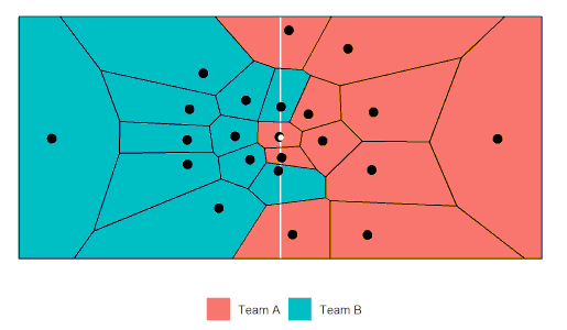 در همین جا اما استفاده از ریاضیات و تحلیل داده سبب شده تا بیش از پیش ارزش کار مدافعان در جاگیری و بازی بدون توپ روشن شود. نمودار ورونویی نموداری است که زمین بازی را به نواحیای تقسیمبندی میکند که در هر لحظه تحت پوشش یک بازیکن است. اگر این نمودار را برای تمامی ثانیههای بازی پیدا کنید، به چیزی شبیه به ویدیوی زیر دست پیدا خواهید کرد که به صورت پویا به شما نشان میدهد هر بازیکن و کل تیم به عنوان یک مجموعهی واحد چطور فضا را در زمین کنترل میکنند. تولید چنین نمودارهایی – سپس خلاصهسازی و تبدیل آنها به متریکهای عددی – تنها به لطف آخرین پیشرفتهای تکنولوژی در زمینهی جمعآوری دادههای موقعیتی (positional) و پیشامدی (event)، از جمله سیستمهای ردیابی مبتنی بر GPS و سیستمهای ردیابی نوری (که دقیقتر اما پرهزینهتر هستند) ممکن است. کمپانیهای بزرگی چون کینکسون (Kinexon) و اسکیلکرنر (SkillCorner) جزو سرآمدان در این حوزه هستند. نمودارهای ورونویی و تحلیلهای مبتنی بر آنها، کاربردهای فراوانی دارند، از جمله اندازهگیریِ: میزان موفقیت یک بازیکن در پوشش فضا، میزان موفقیت یک بازیکن در پیدا کردن فضا، میزان موفقیت یک بازیکن در پیدا کردن همتیمیها در فضا، واکنش تیمی در پی از دست دادن مالکیت، میزان موفقیت در عریض کردن زمین و … .
