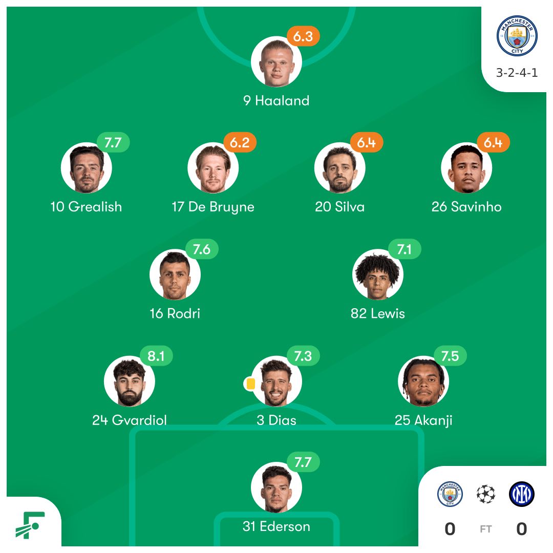 ۴. در نیمهی دوم و خصوصا با نزدیک شدن به دقیقهی ۶۰، شرایط کمی متفاوت شد. کوین دیبروینه که در اواسط نیمهی اول کمی احساس ناراحتی میکرد، جای خود را به گوندوغان داد و فودن هم به جای ساوینیو که نیمهی اول چندان خوبی نداشت، وارد زمین شد. سیتی در نیمهی دوم بعد از تعویضهای خود جان تازهای گرفت و هم در دفاع و هم در حمله عملکرد بسیار بهتری نسبت به نیمهی اول داشت. آنها با وجود دفاع فشردهی تیم اینتر توانستند موقعیتهای زیادی را در نیمهی دوم ایجاد کنند، ولی آنها هم مانند اینتر دقت لازم برای گل کردن موقعیتهای خود را نداشتند و از ۲۲ شوتی که به سمت دروازهی اینتر روانه کردند، فقط ۵ شوت در چهارچوب بود، در حالی که ۱۶ تا از شوتها را از داخل محوطهی جریمه شلیک کرده بودند. سیتی در این بازی در حالی بدون گل زده زمین بازی را ترک کرد که ۲.۳۵ xG را از خود به جا گذاشته بود تا نشان دهد پپ گواردیولا باید فکری به حال گلزنی تیم خود، در روزهایی که روز هالند نیست، بکند. در دو مورد ایلکای گوندوغان با ضربات سر از فاصلهی بسیار نزدیک و یک بار هم گواردیول با شوتی که بدون بازیکن معارض از داخل محوطهی جریمه زد، شانس این را داشتند که کار را تمام کنند، اما تمام این ضربات با بیدقتی و همچنین جاگیری خوب سومر دروازهبان اینتر که روز بسیار خوبی داشت، منجر به گل نشد. اینتر نیز نه به اندازه نیمهی اول ولی در این نیمه هم توانست یکی دو بار به دروازهی سیتی نزدیک شود و خصوصا طارمی نقش بسیار مهمی در ترنزیشن تیم از دفاع به حمله داشت و معمولا وظیفهی خود را در انتقال به خوبی ایفا میکرد؛ اما باز هم بیدقتی در ضربات آخر این بار توسط دارمیان و میخیتاریان باعث شد اینتر هم نتواند به گل برسد.