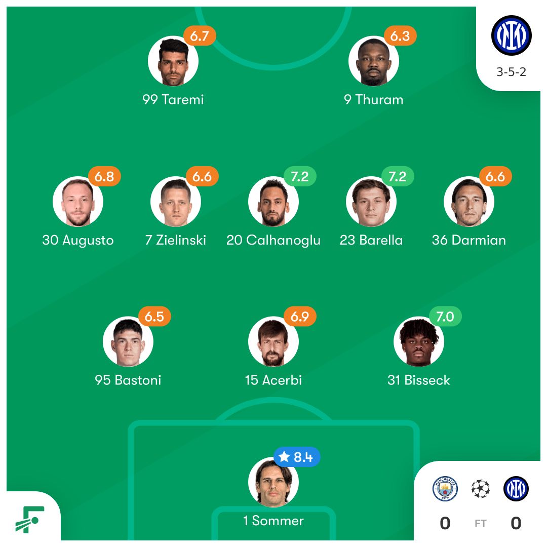 ۶. اینزاگی در نیمهی دوم با تعویضهای خود سعی کرد قدرت بدنی و ذهنی تیم خود را برای بازی بینقص در برابر بازیسازی سیتی در فضای شلوغ جلوی محوطه حفظ کند. گرچه این اتفاق با نرخ موفقیت نیمهی اول رخ نداد، اما سرانجام در کسب یک امتیاز موثر بود و اینتر با دست خالی اتحاد را ترک نکرد. اینزاگی در این بازی دوباره ثابت کرد که همچنان یکی از بهترین ۲-۵-۳ های حال حاضر اروپا را به نمایش میگذارد و اینتر او میتوانند کابوس هر تیمی باشد؛ حتی تیمی که بدون توفق در لیگ برتر انگلیس رقبا را درو میکند. البته برای اینکه زهر تیم او بیشتر شود، بازیکنان باید دقت خود را در تمامکنندگی افزایش دهند.